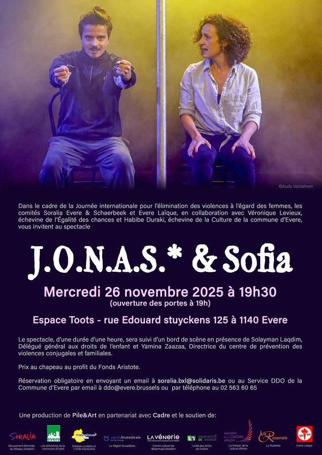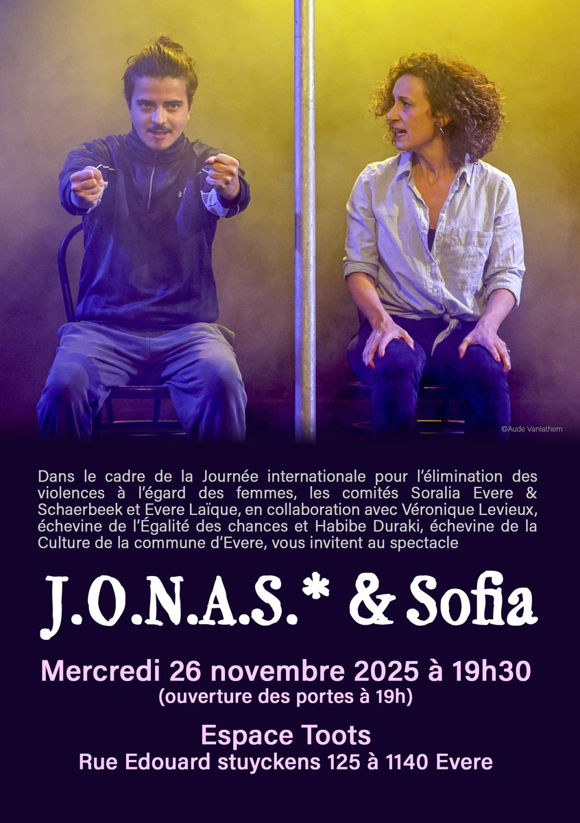 J.O.N.A.S. & Sofia, qui se tiendra le mercredi 26 novembre 2025, de 19 h à 21 h 30, à l’Espace Toots (Rue Édouard Stuckens 125, 1140 Evere).