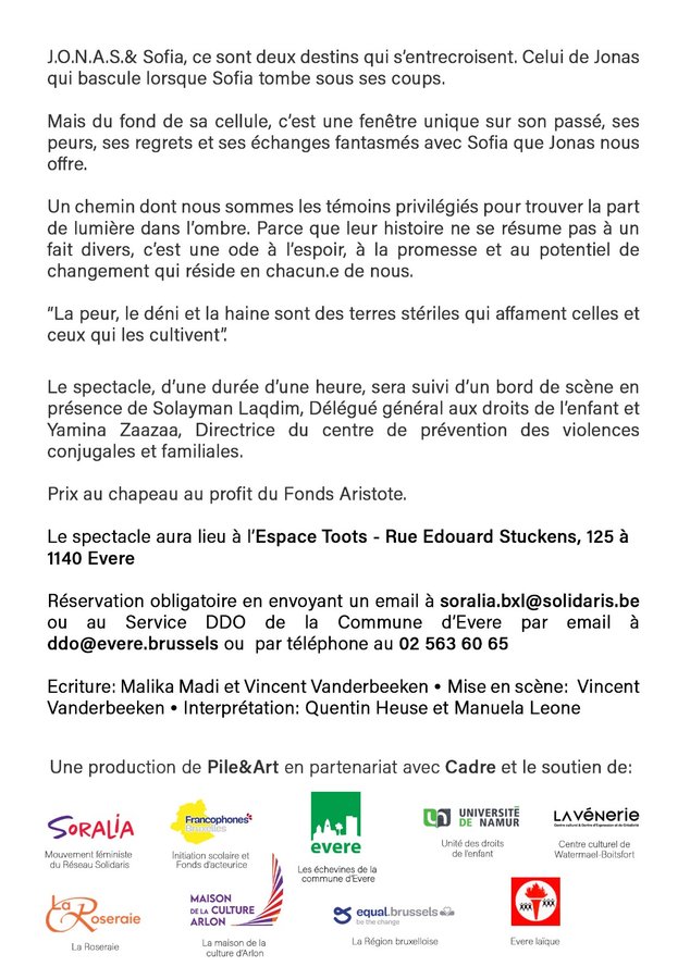 Dans le cadre de la Journée internationale pour l’élimination des violences à l’égard des femmes et celle des droits de l’enfant, les comités Soralia Evere et Soralia Schaerbeek ont l’honneur de vous inviter au spectacle