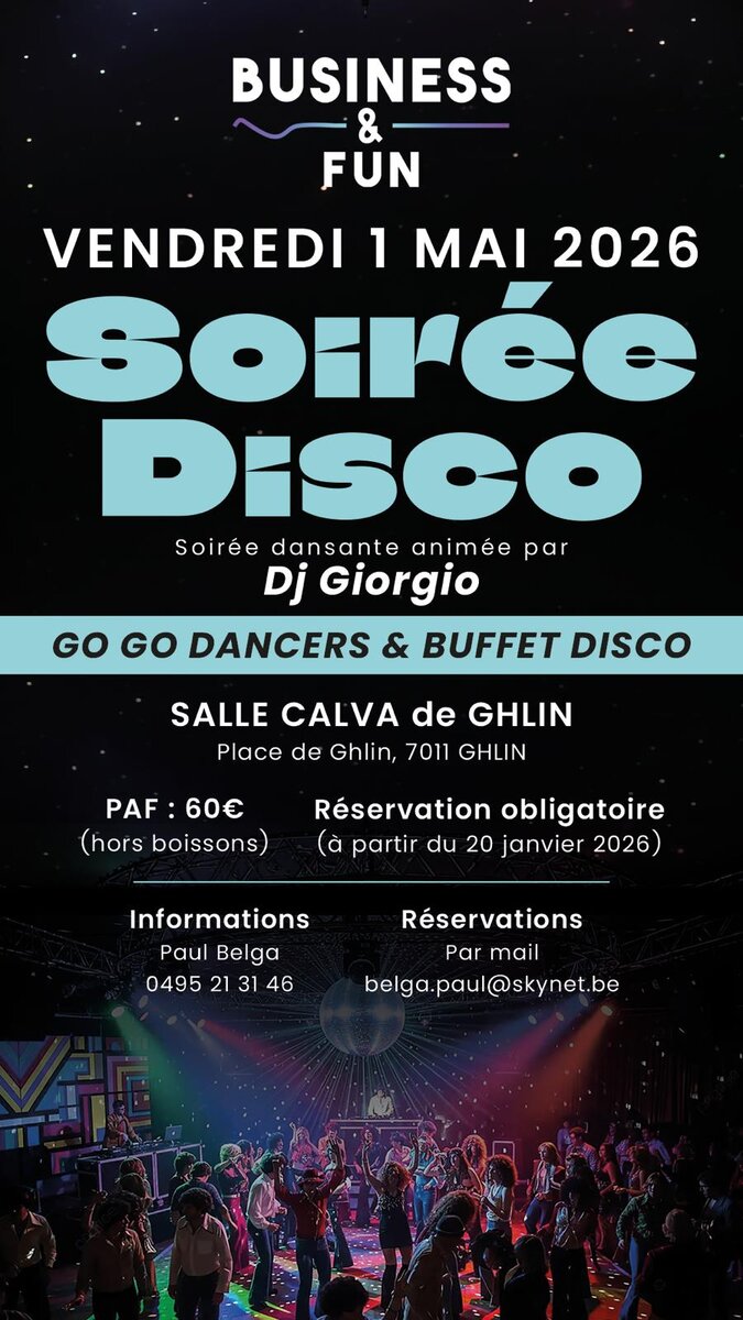 Notre Asbl Business And Fun organise une belle soirée Disco ce vendredi 1er mai à la Salle Calva de Ghlin.