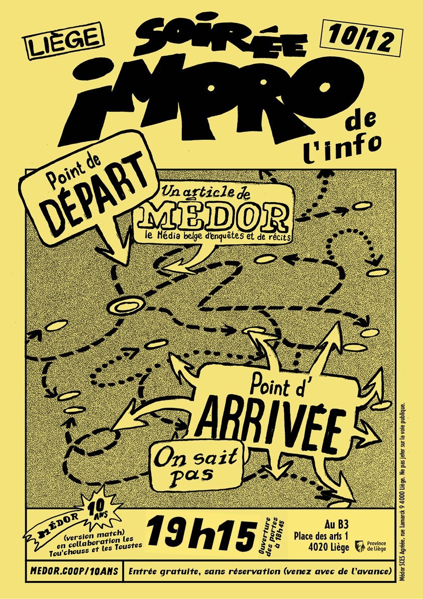 Le média belge indépendant Médor fête ses 10 ans et — au passage — son 41e numéro avec vous, le 10 décembre. Venez découvrir ce que les improvisateur·ices feront des contenus journalistiques de ce