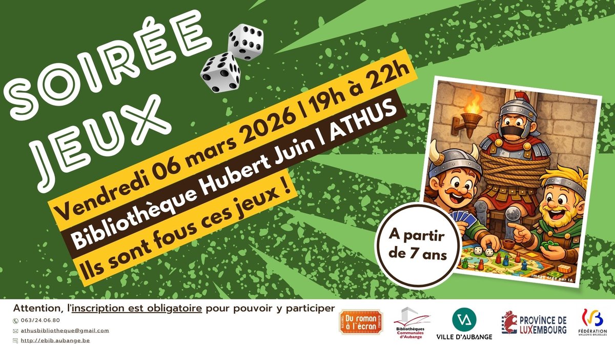 La bibliothèque d’Athus vous invite à une soirée où stratégie, rires et bonne humeur seront au rendez-vous. Inspirée par l’esprit joyeusement déjanté des irréductibles Gaulois, cette soirée jeux promet des défis épiques et des parties endiablées dignes d’un banquet d’Astérix et Obélix.
