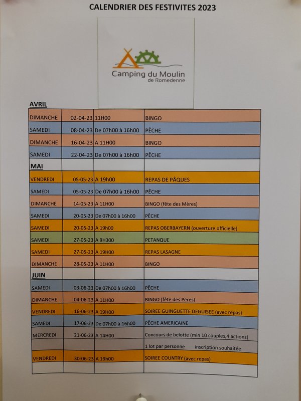 Pour recevoir le calendrier ou consulter la page fb camping du Moulin de Romedene (avec un seul N)!