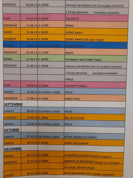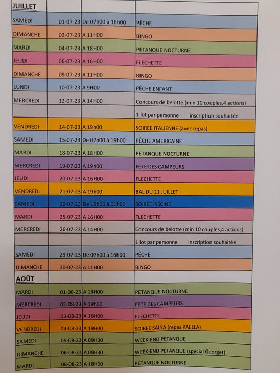 Soirées à thème toutes les 2 semaines. Bingo, concours de fléchettes, pêche à blanc, pétanque restauration sur place.