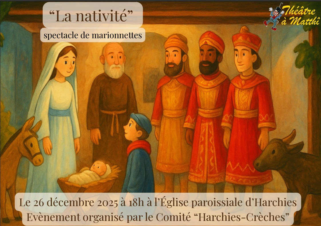 Un magnifique spectacle de marionnettes géantes est proposé à vous, adultes, ados et enfants par le théâtre à Matthi à l'église d'Harchies à l'occasion du concours de crèches.