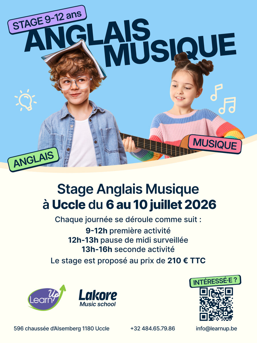 Tarif : 210€ à verser sur le compte de Learn Up asbl au moment de l'inscription, en indiquant en communication "prénom + nom de l'enfant + Stage Anglais/musique juillet", sur le numéro de compte suivant : Be84 0689 3503 4759