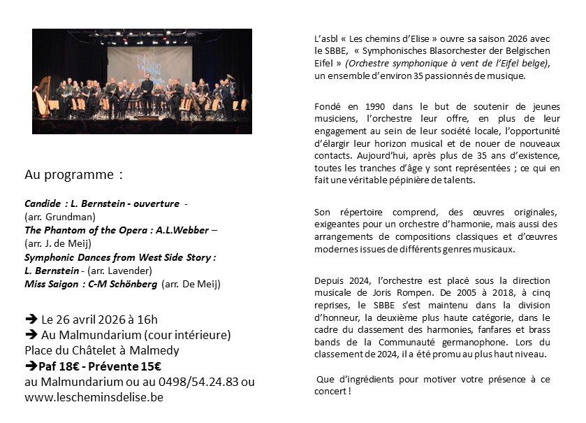 L’asbl « Les chemins d’Elise » ouvre sa saison 2026 avec le Sbbe,  « Symphonisches Blasorchester der Belgischen Eifel » (Orchestre symphonique à vent de l’Eifel belge), un ensemble d’environ 35 passionnés de musique.