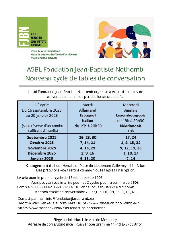 | Tables de conversation en 6 langues (DE, En, Es, It, Lu, Nl) (Du 16 septembre 2025 au 21 janvier 2026 - Arlon) | |