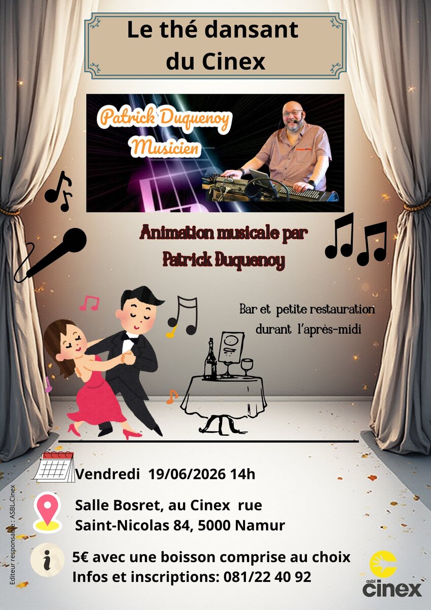 Nous organisons un après-midi thé dansant à l'asbl Cinex et vous y êtes convié.