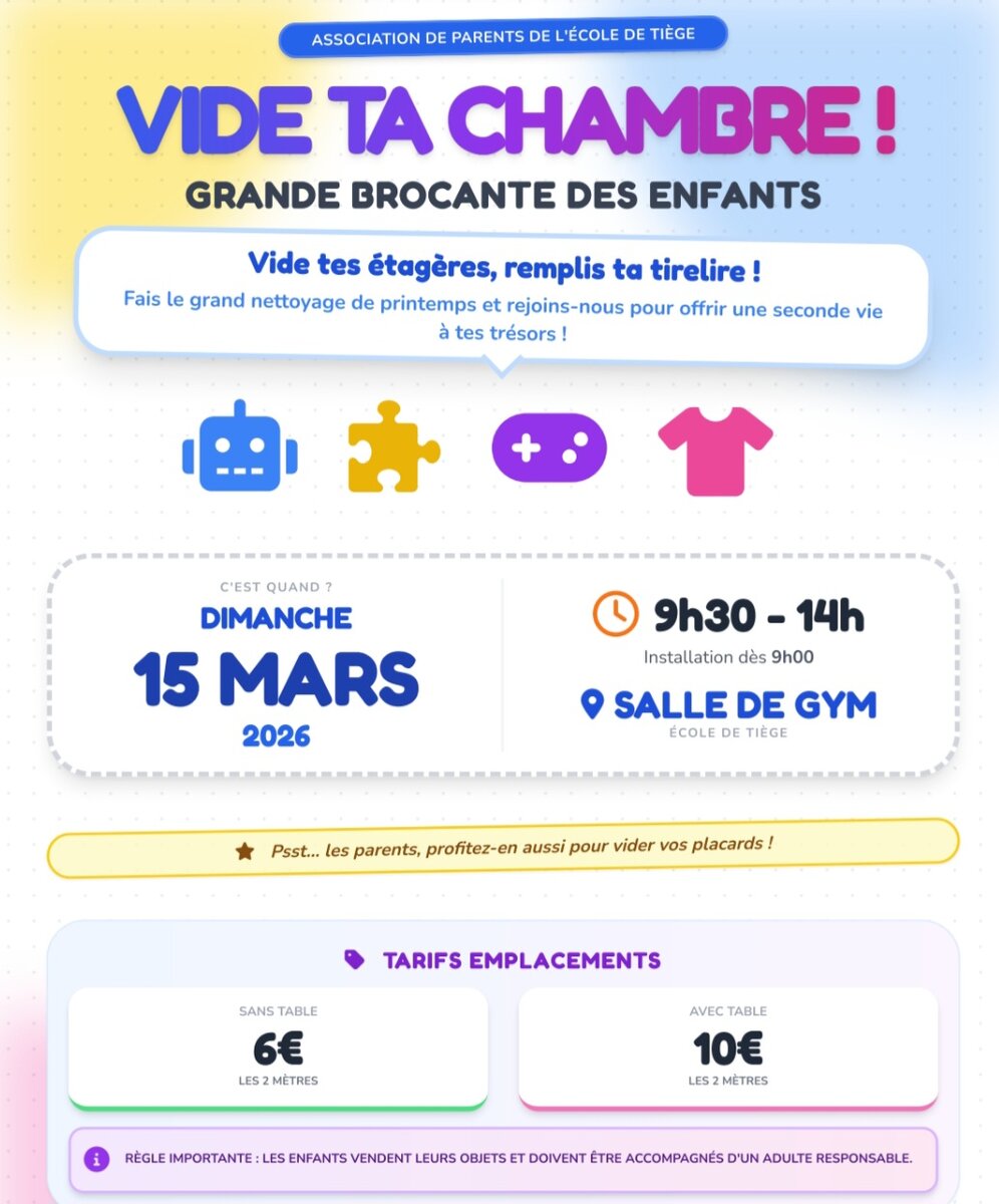 L’Association de Parents de l'école de Tiège a le plaisir de vous inviter à la Grande brocante des enfants (et des parents) !