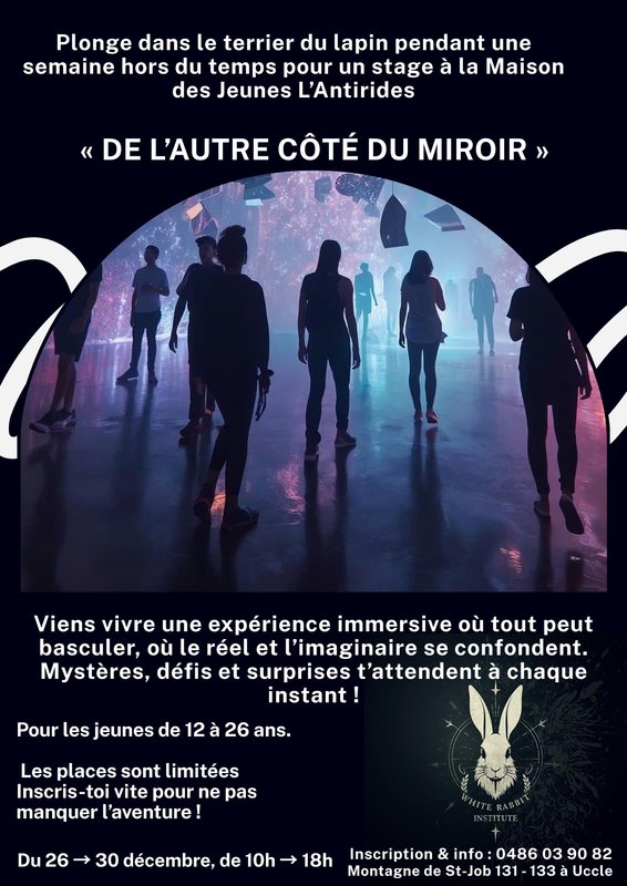 Viens vivre une expérience immersive lors d'un stage du 26 au 30 décembre pendant les congés d'hivers, de 10 à 18H à la maison des jeunes l'Antirides ! Pour les jeunes de 12 à 26 ans ! Inscris toi dés maintenant, les places sont limitées !