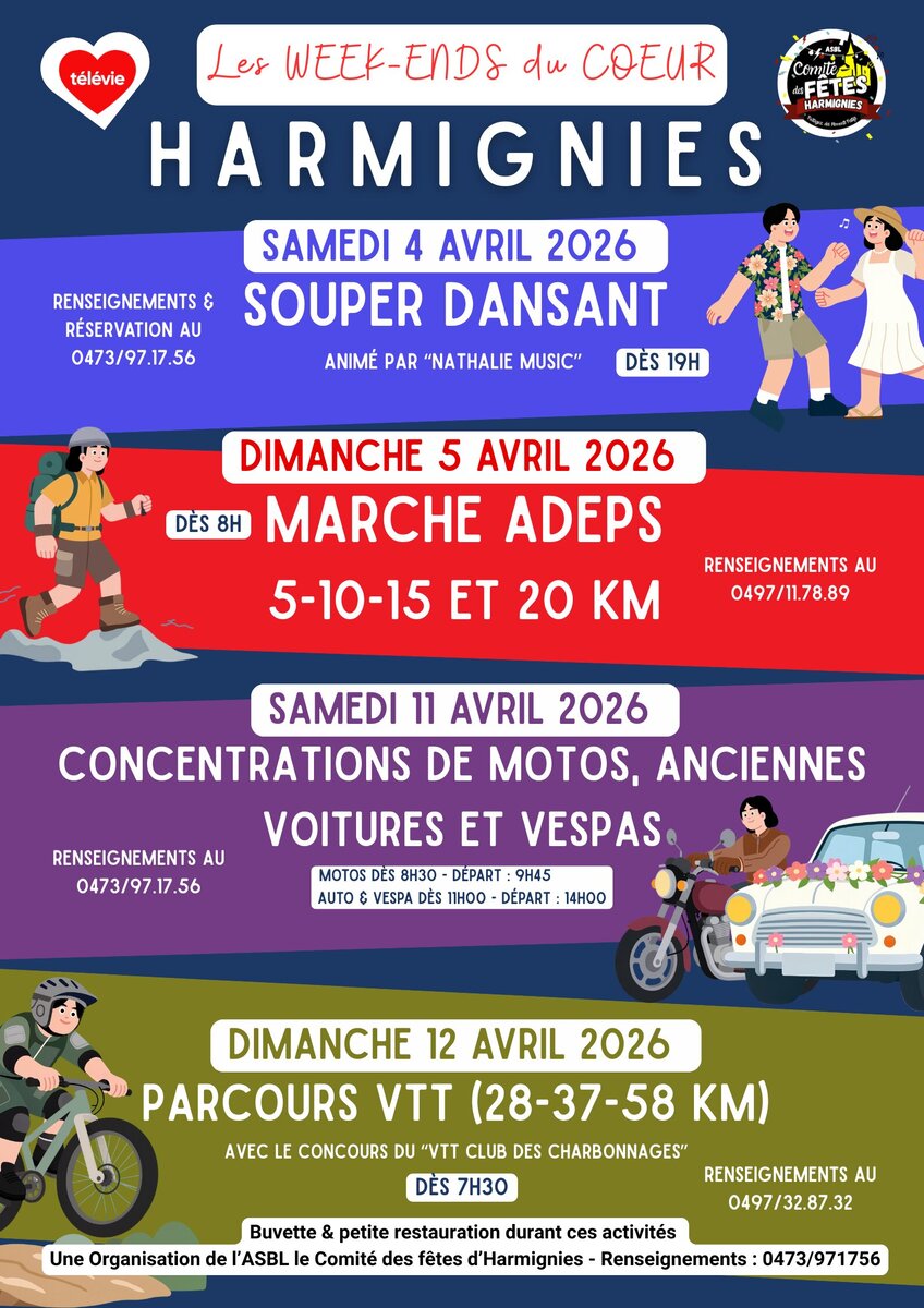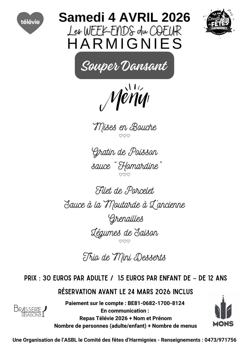 les réservations sont obligatoires et les repas sont à verser sur le compte de l",Asbl comité fêtes D'Harmignies