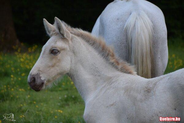 Elle est née en box chez nous mais vit actuellement en prairie avec d’autres poulains de son âge et des tatas.