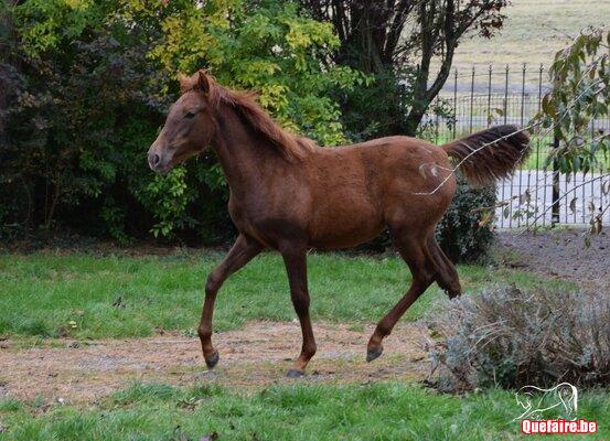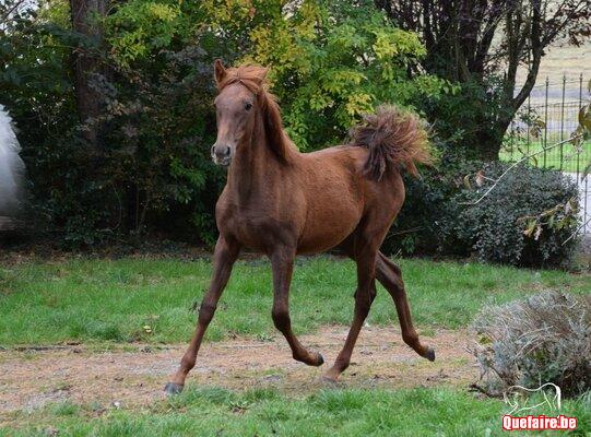 Pour la robe, nous hésitons toujours entre l’alezan et le palomino. Un test déterminera sa couleur définitive même si nous pensons davantage qu’elle sera alezane (comme son pure frère).