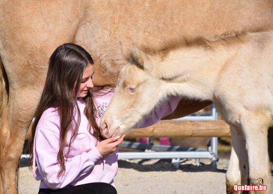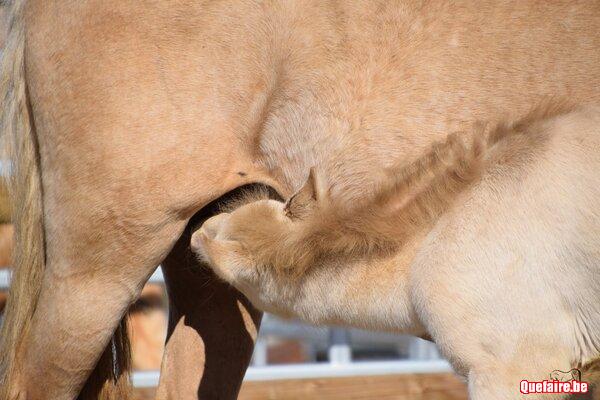 Il est né en box chez nous mais vivra, dès que le beau temps le permet, en prairie avec d’autres poulains de son âge et des tatas.