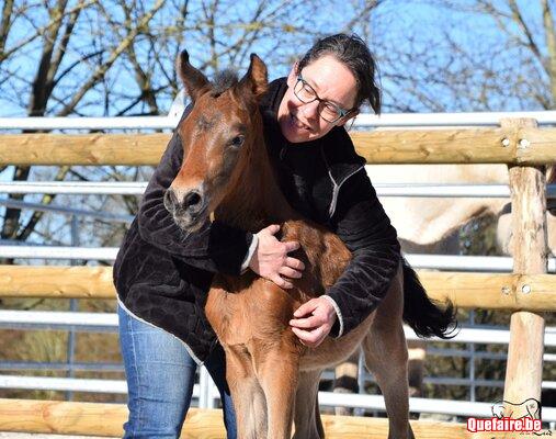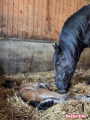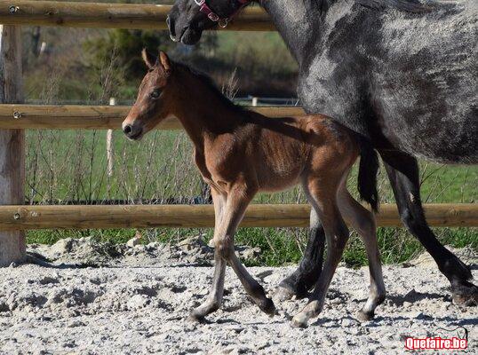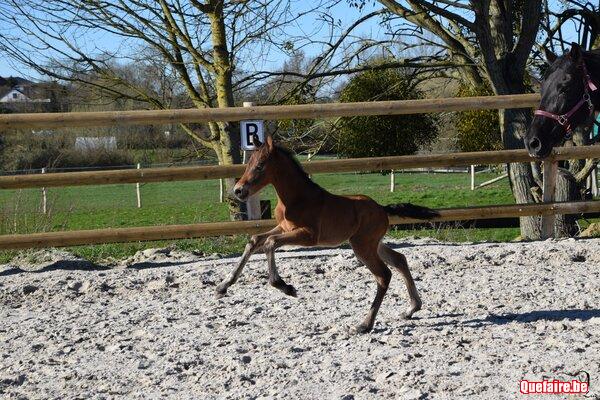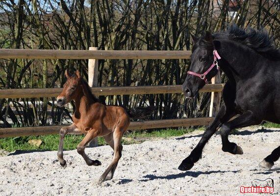 Il est né en box chez nous mais vivra, dès que le beau temps le permet, en prairie avec d’autres poulains de son âge et des tatas.