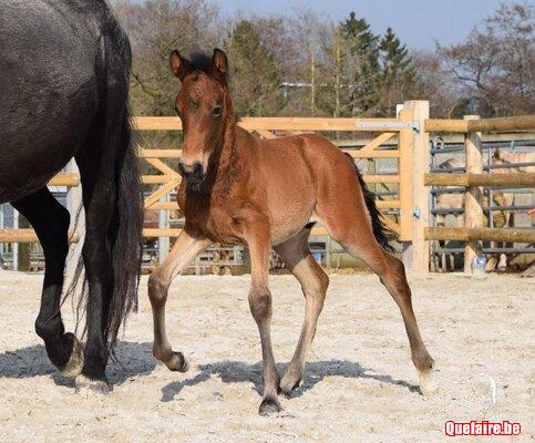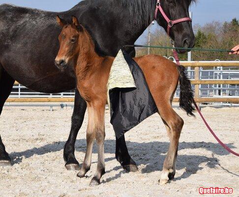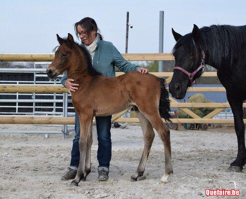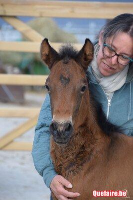 Il est né en box chez nous mais vivra, dès que le beau temps le permet, en prairie avec d’autres poulains de son âge et des tatas.