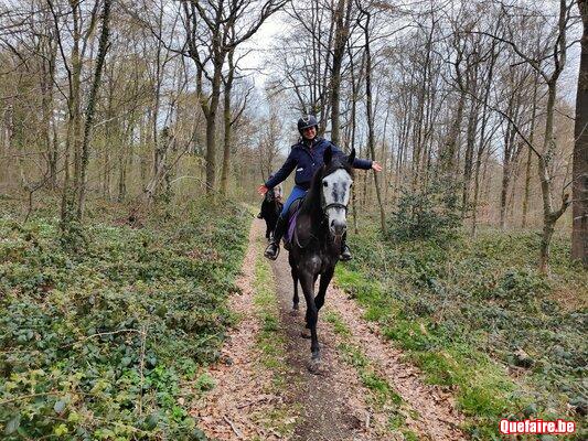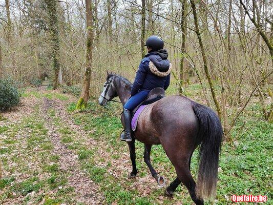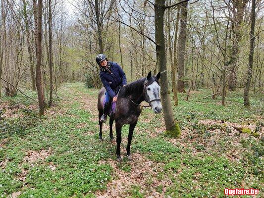 En balade, il peut partir seul sans souci, il ne regarde rien, n’a pas peur de la circulation (bus, tracteur, camion, chien, remorque,…), il passe également sans souci un gué, il traverse les ponts…. On peut également le mettre dans un groupe et il est hyper sympa avec les autres même si un cheval le colle un peu derrière, jamais une mauvaise oreille, toujours de la gentillesse. Il apprécie être devant car il a un vrai bon pas mais il peut également être derrière sereinement, sans essayer de dépasser.