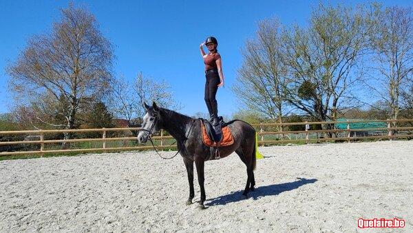 En balade, il peut partir seul sans souci, il ne regarde rien, n’a pas peur de la circulation (bus, tracteur, camion, chien, remorque,…), il passe également sans souci un gué, il traverse les ponts…. On peut également le mettre dans un groupe et il est hyper sympa avec les autres même si un cheval le colle un peu derrière, jamais une mauvaise oreille, toujours de la gentillesse. Il apprécie être devant car il a un vrai bon pas mais il peut également être derrière sereinement, sans essayer de dépasser.